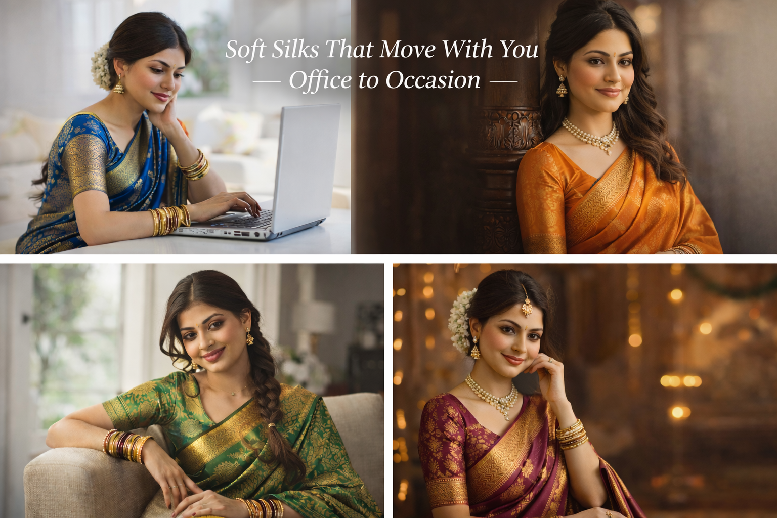 Each Kanchi soft silk saree in our collection is woven with premium silk threads that offer a smooth drape and a graceful fall. The soft silk texture provides comfort while maintaining the luxurious sheen that Kanchipuram sarees are famous for. From traditional temple borders and classic zari motifs to contemporary pastel tones and elegant designs, our collection beautifully blends tradition with modern sophistication.