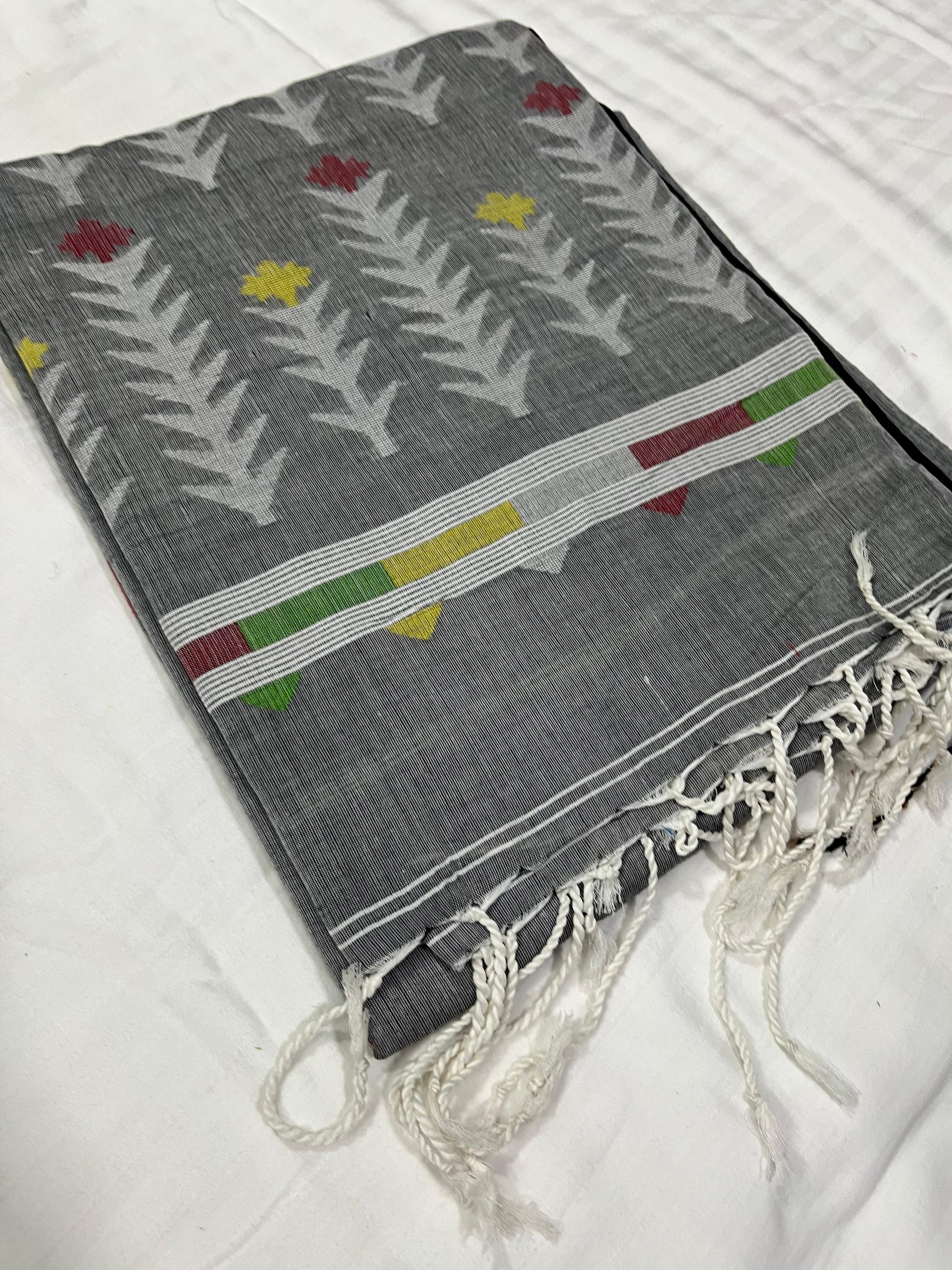 Dhaka Mulmul Cotton Saree - Grey Base with Balu Chudi Motifs