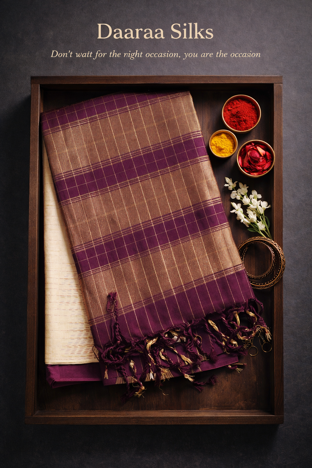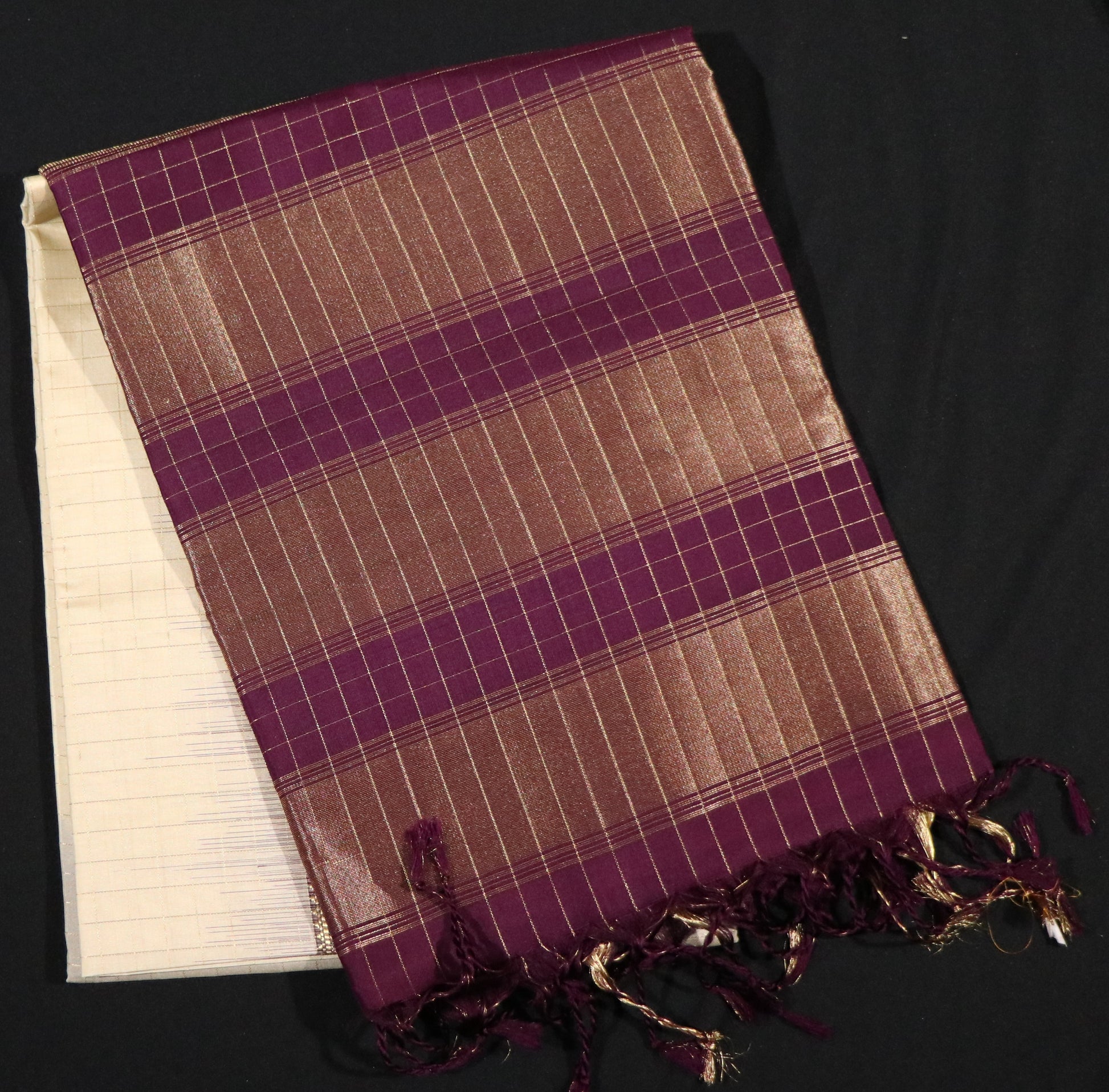 • Design: Pristine cream body featuring a traditional old zari grid pattern forming a refined checked design, complemented by a deep wine contrast border