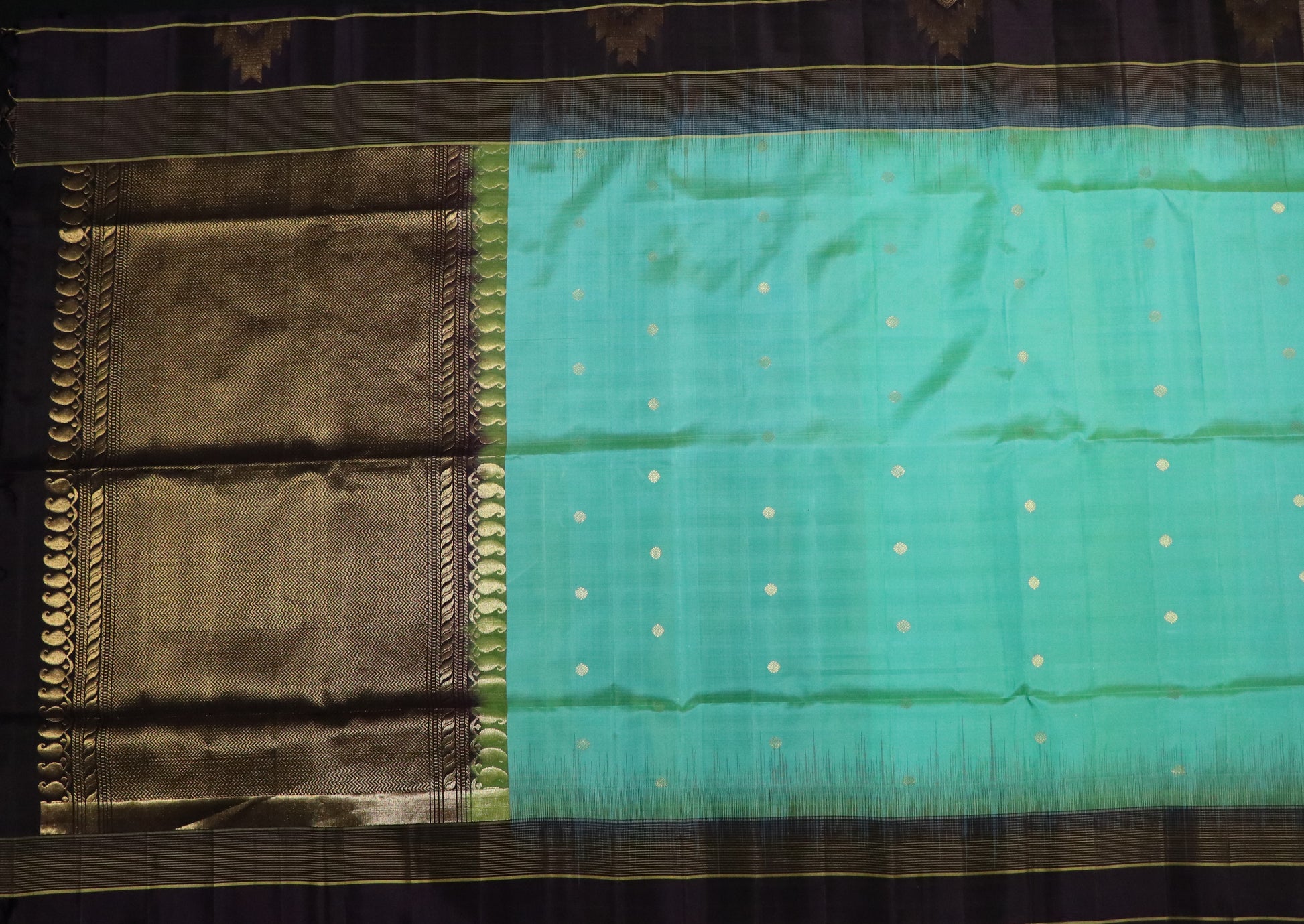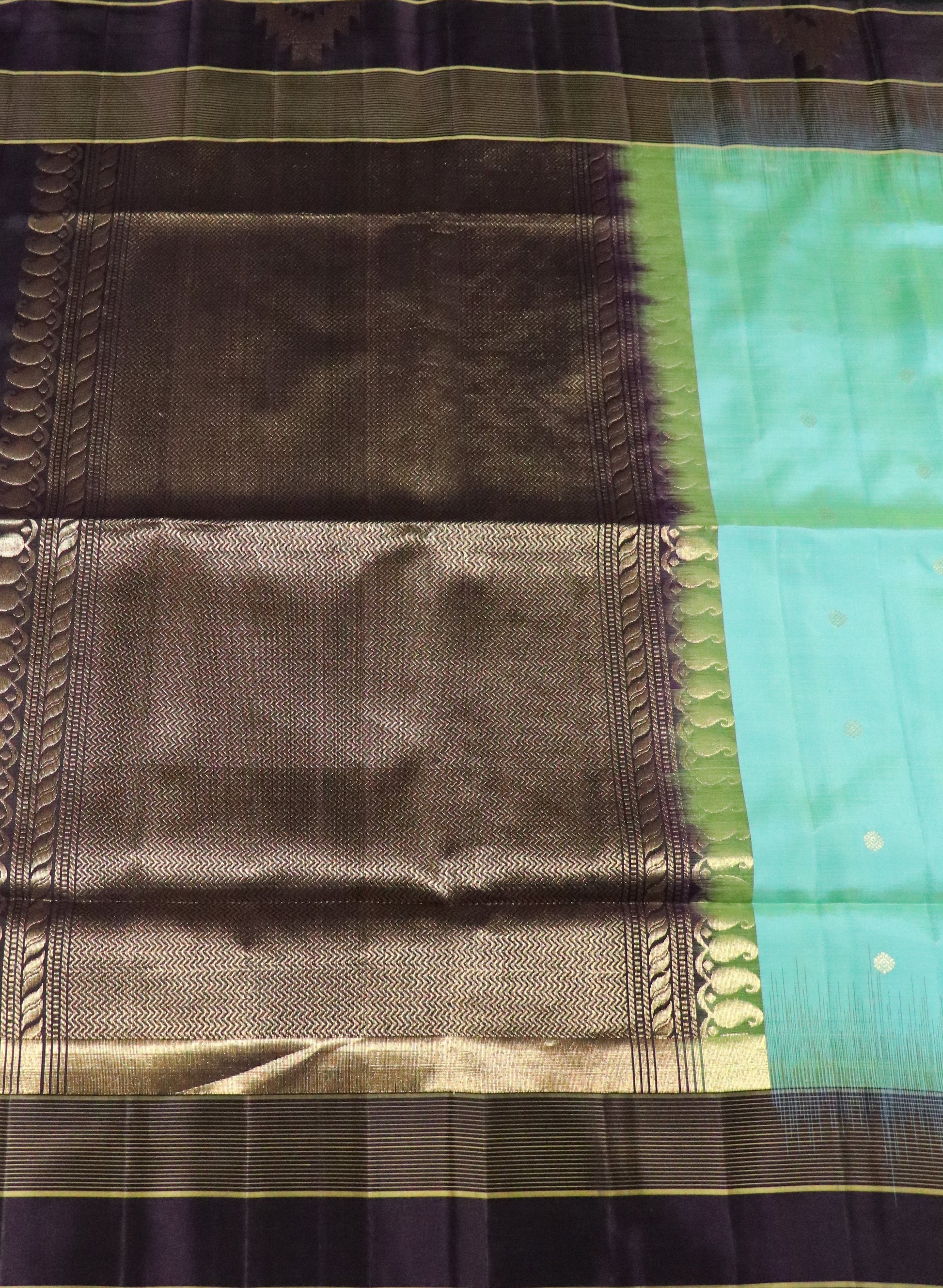 • Design: Turquoise blue-green body with delicate gold zari buttas and contrast brown border
