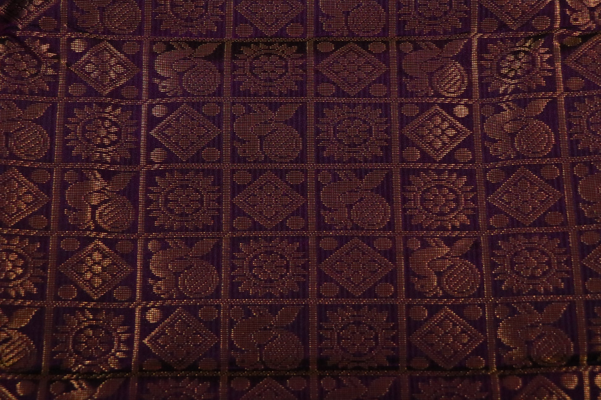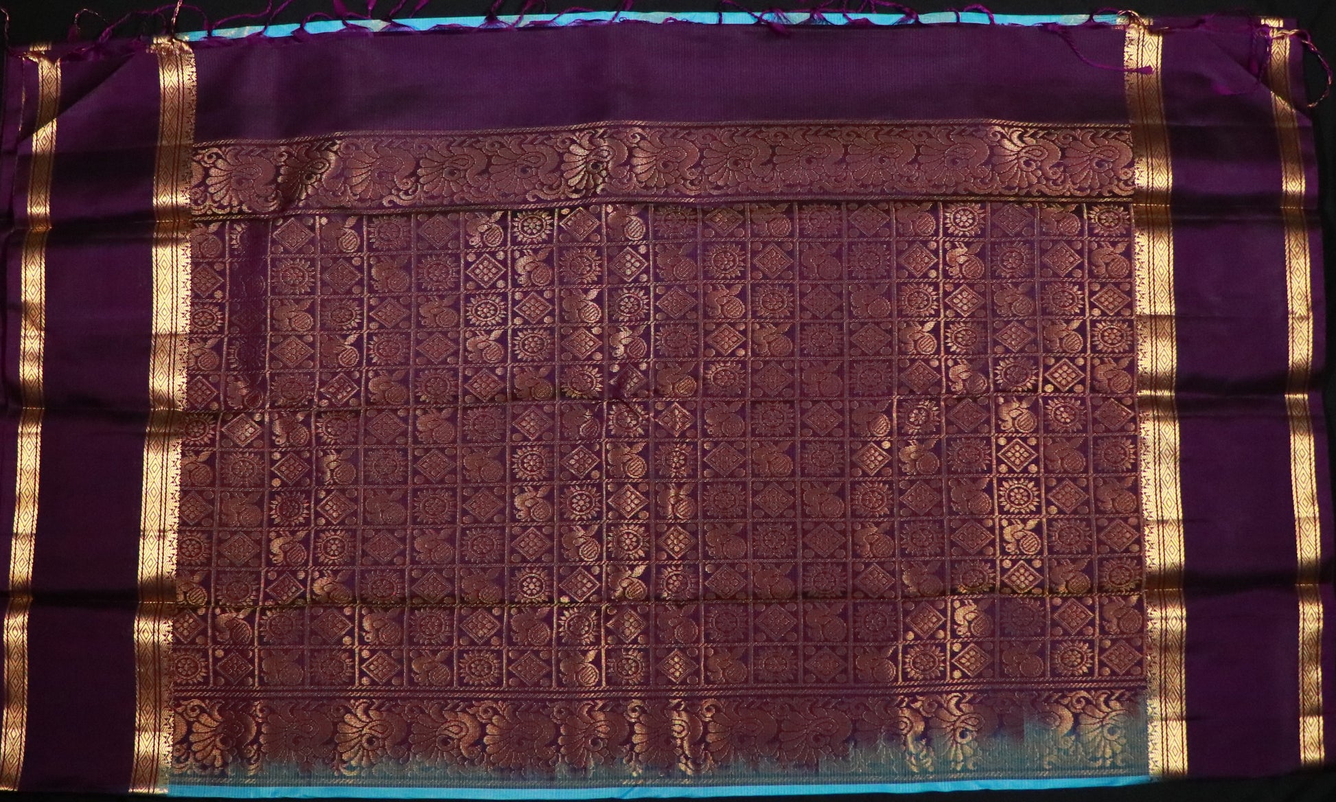 ✔ Deep purple contrast border with intricate geometric zari patterns