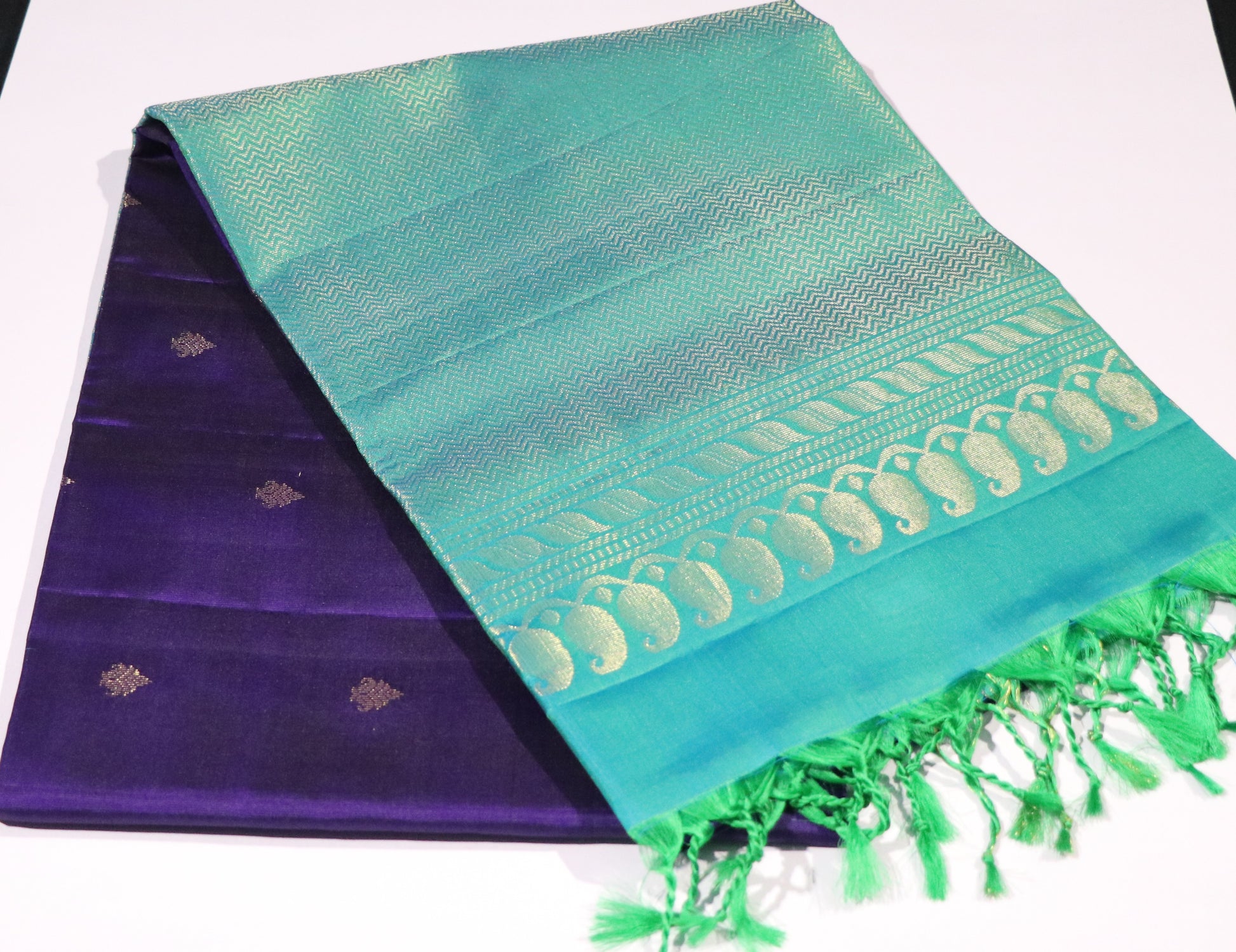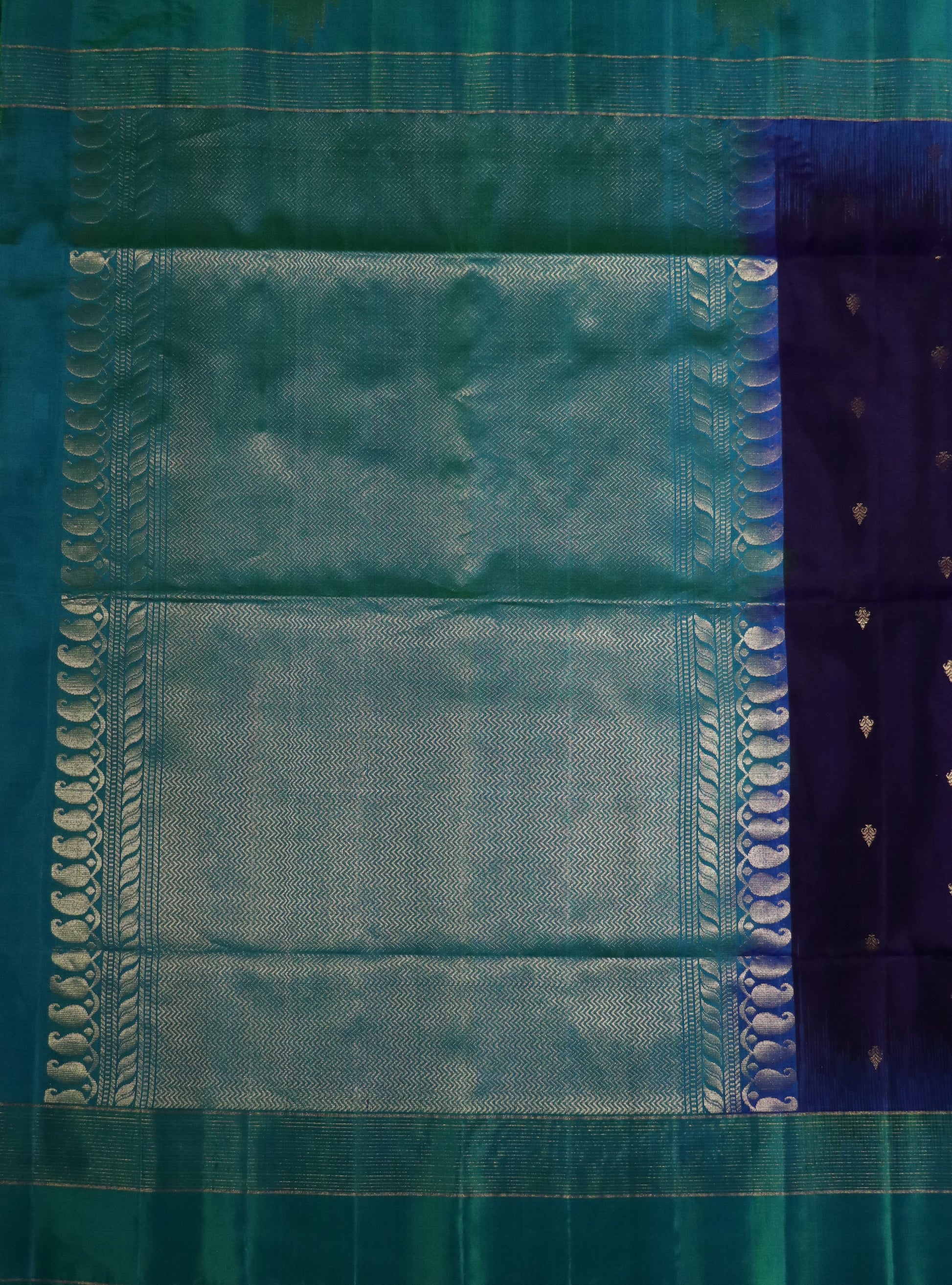 • Design: Deep royal purple body adorned with delicately spaced gold zari buttas, complemented by a striking teal and sea-green border and pallu featuring intricate antique gold zari work