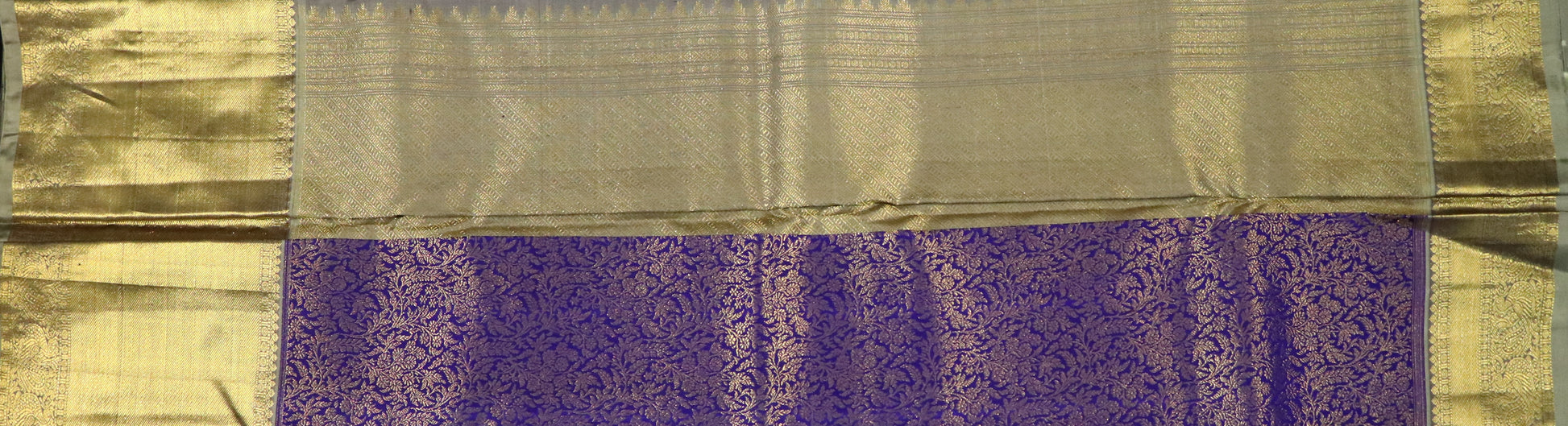• Design: Rich royal purple body intricately woven with antique gold zari floral and vine motifs, complemented by a broad antique gold zari border