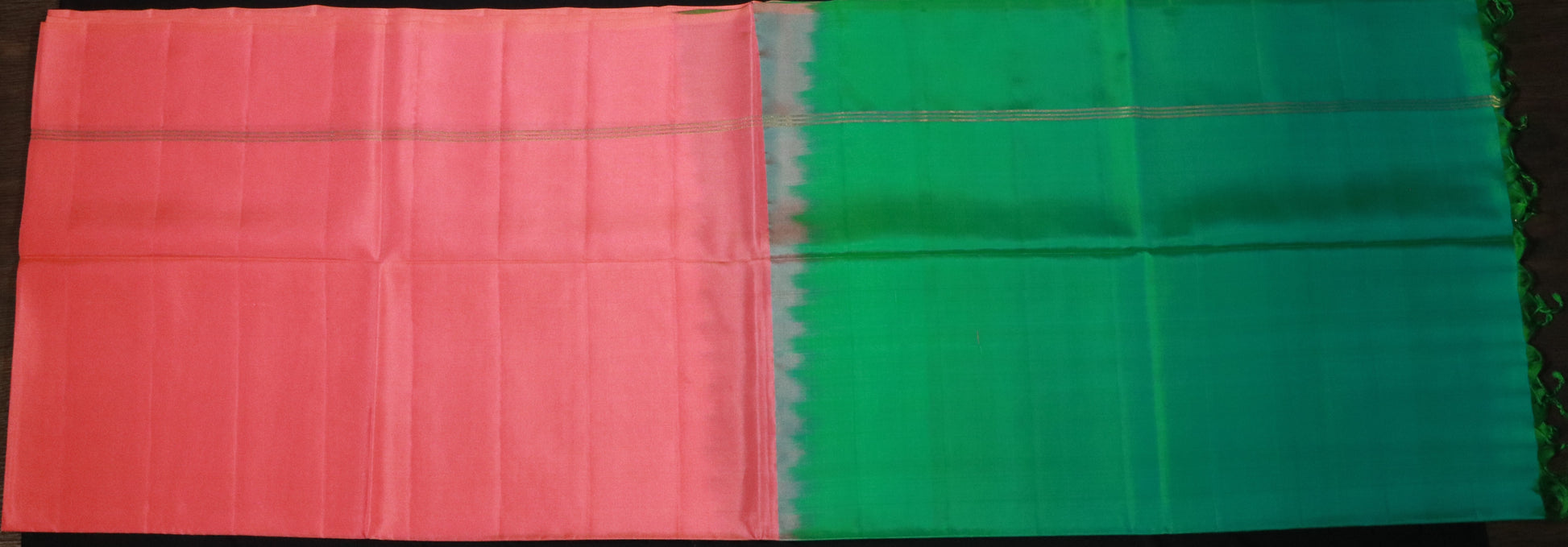 • Design: Soft pink body paired with a striking verdant green pallu, creating a refined contrast of complementary hues