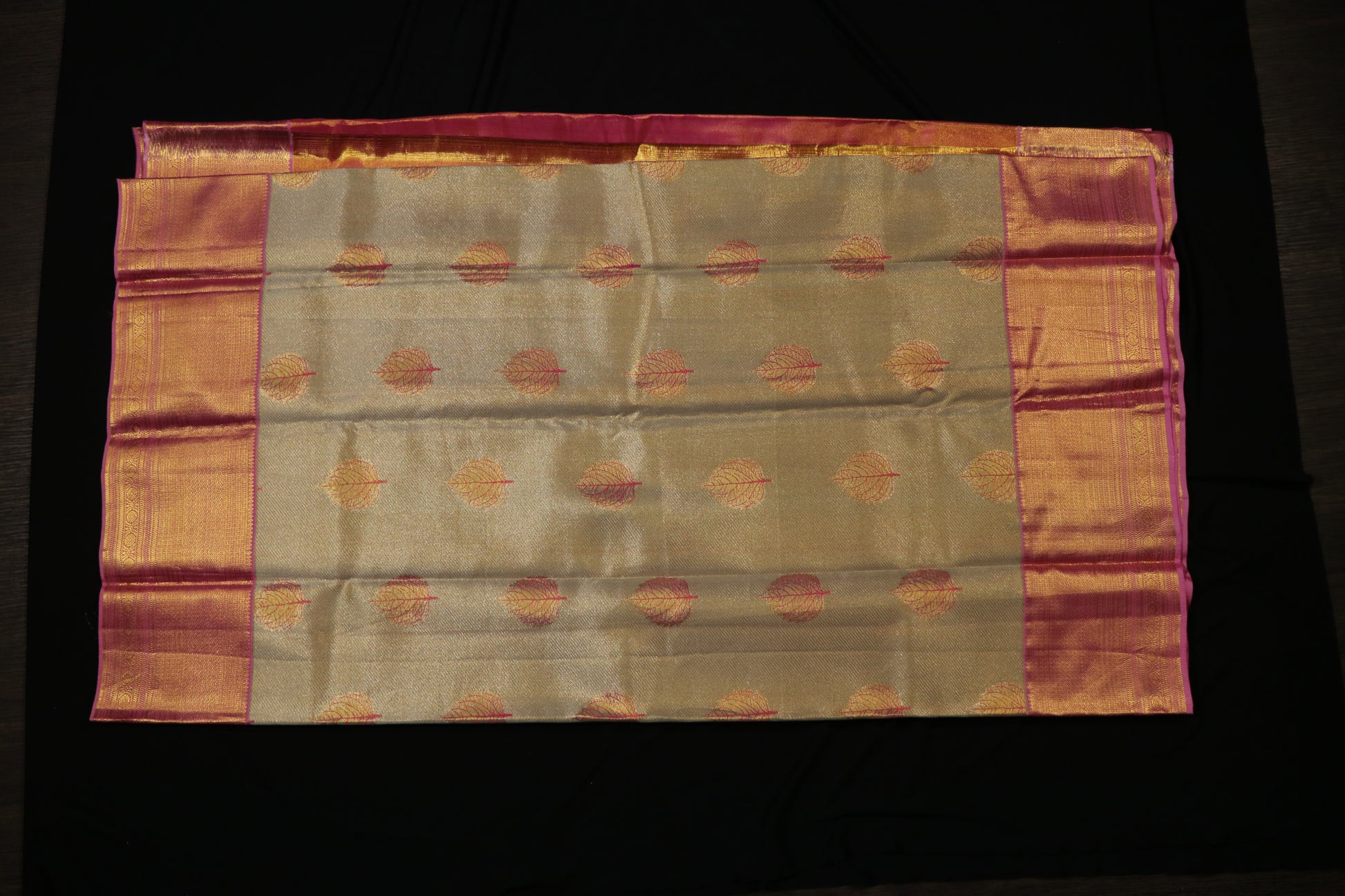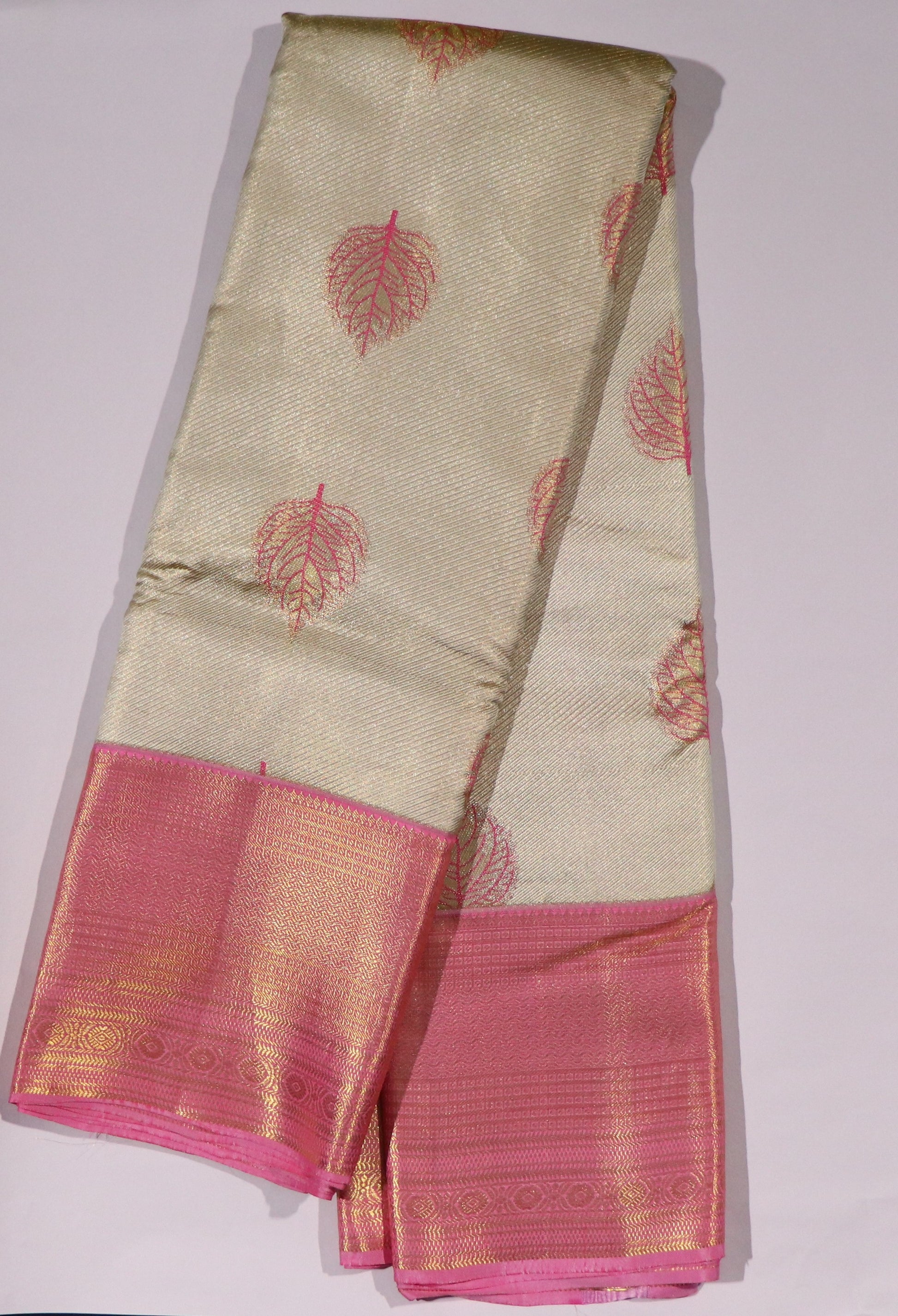 • Design: Soft champagne gold body with delicate pink leaf buttas, complemented by a striking rose-pink and gold zari border featuring intricate traditional weaving