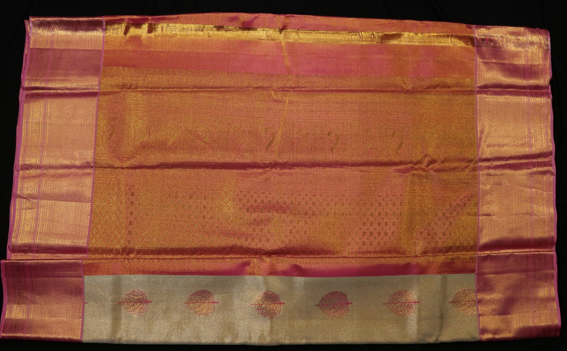 ✔ Striking rose-pink border enriched with intricate gold zari weaving