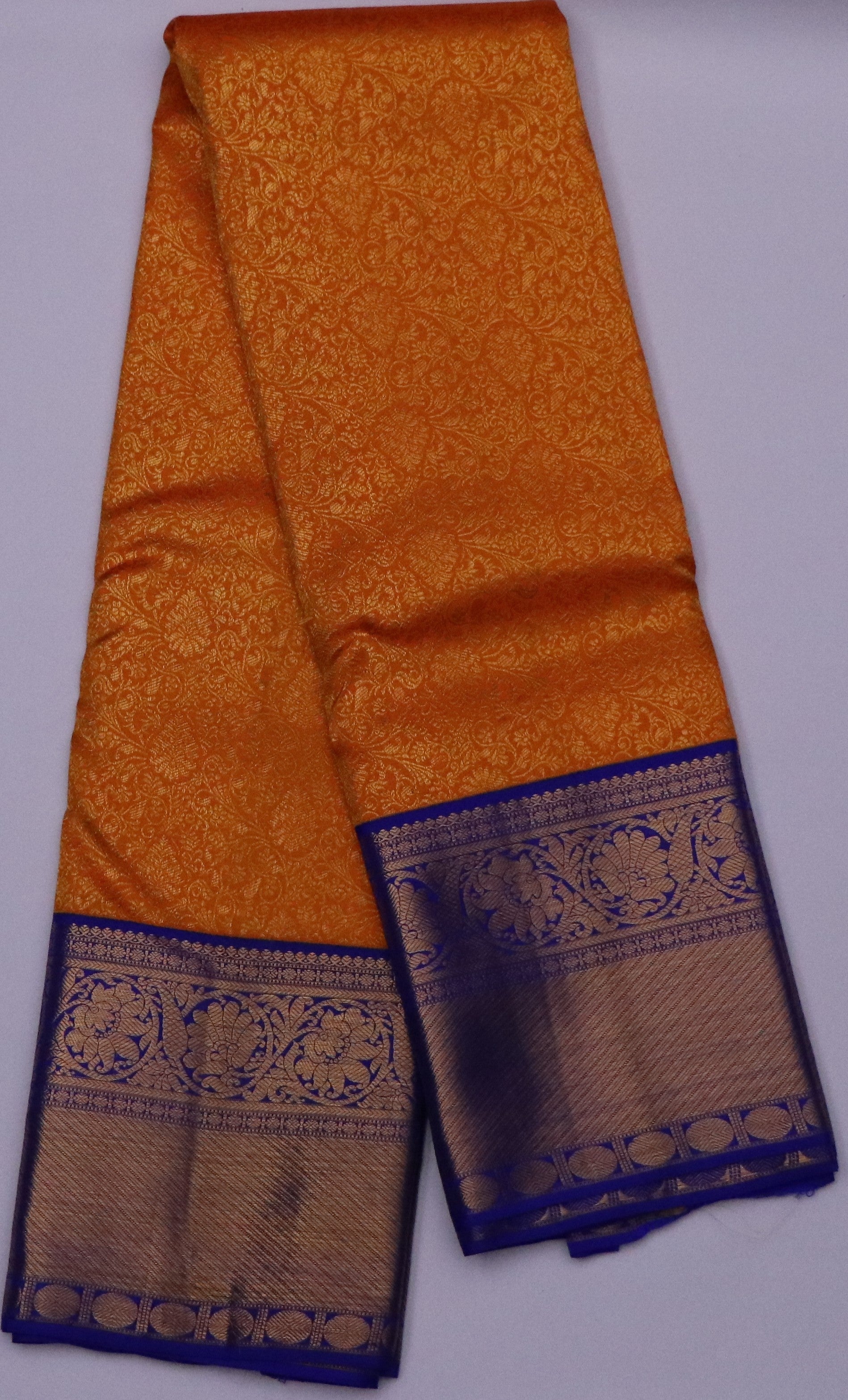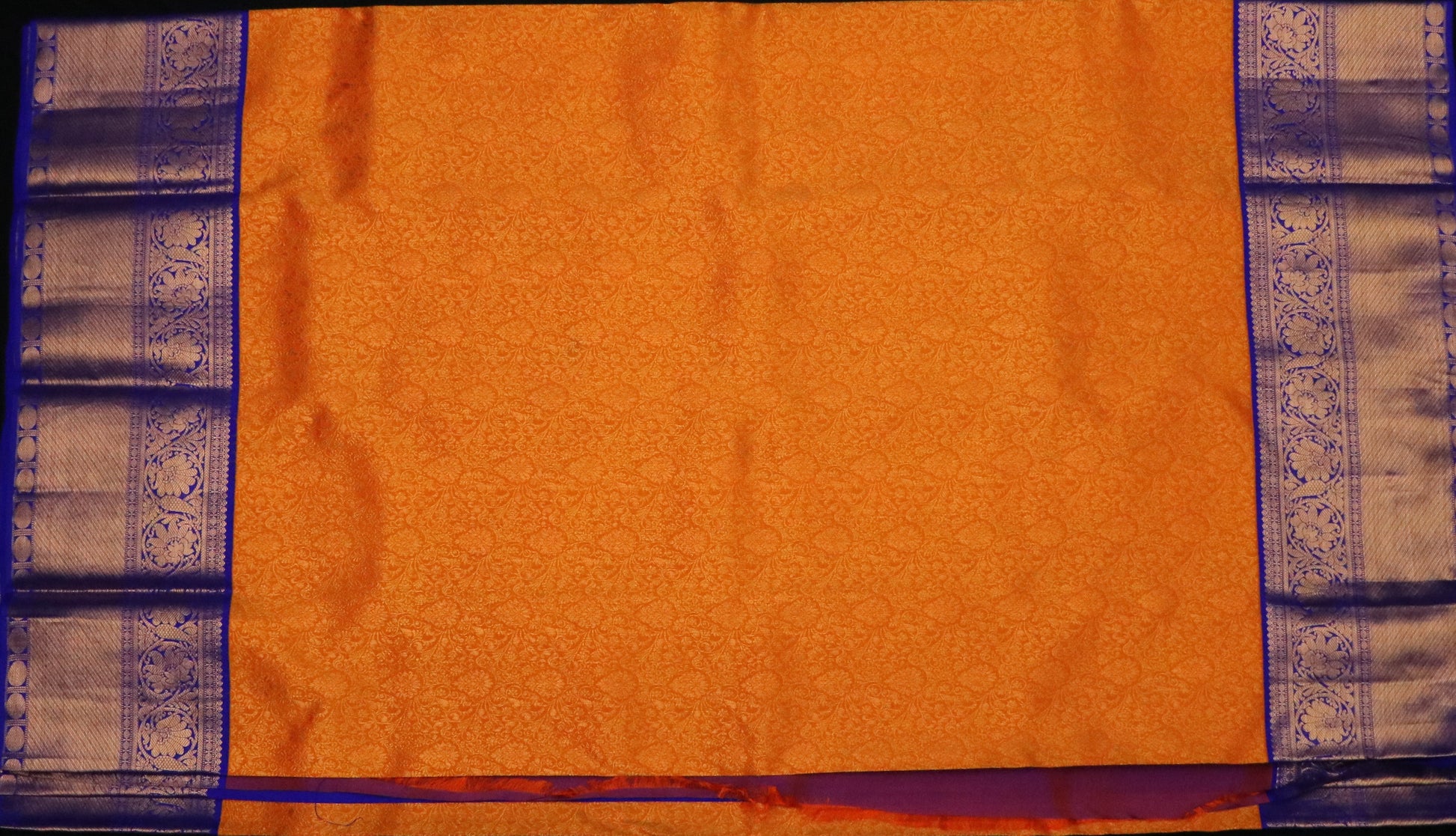 • Design: Marigold orange body with intricate floral jaal jacquard, complemented by a royal cobalt blue border and pallu