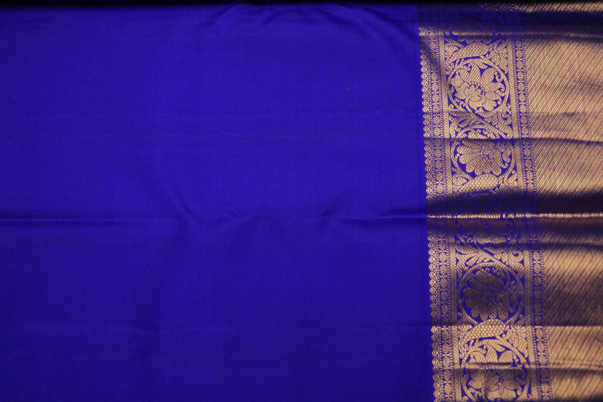 ✔ Striking royal cobalt blue border and pallu creating bold contrast