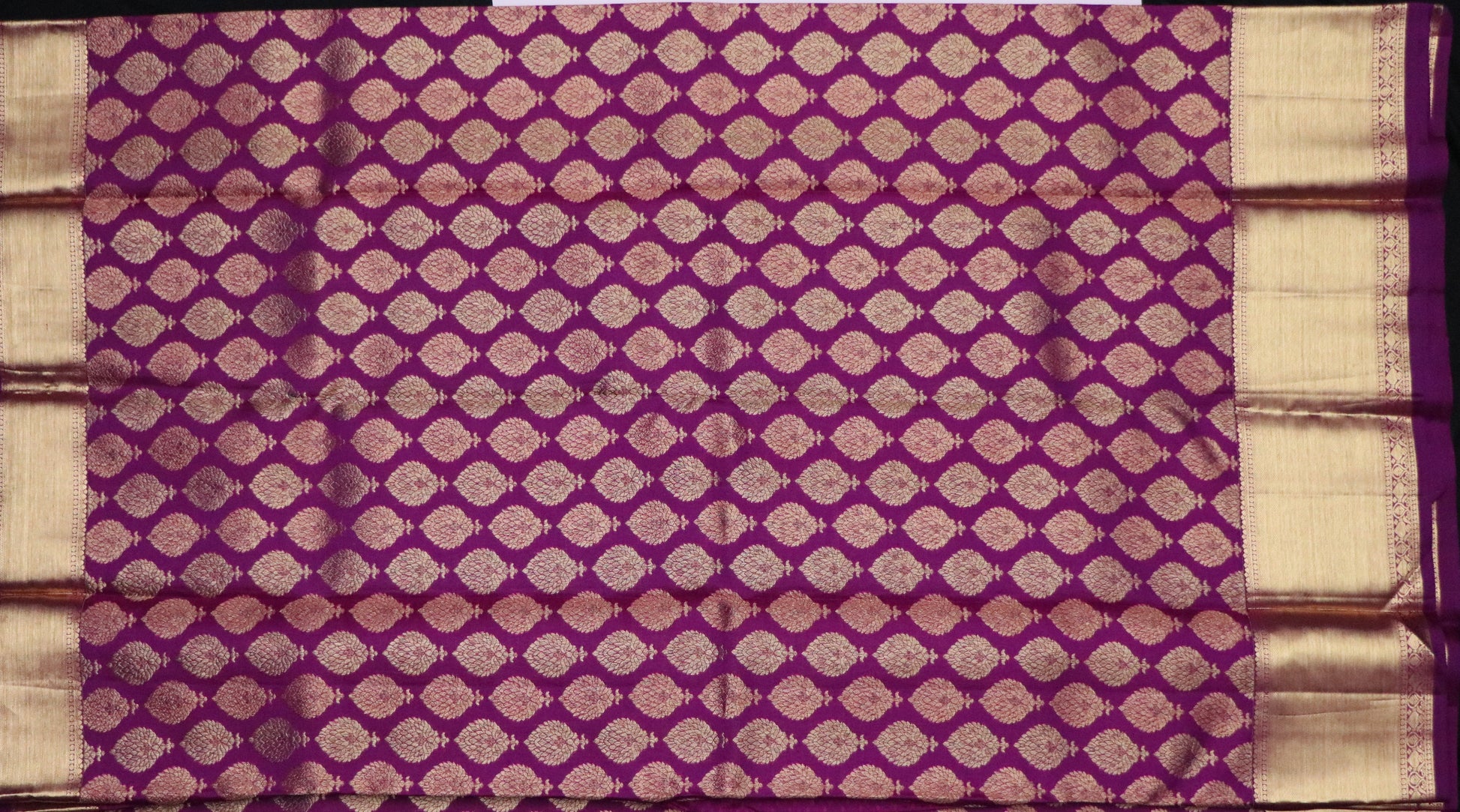 • Design: Wine purple body featuring intricate jacquard-woven buttas with antique gold zari detailing