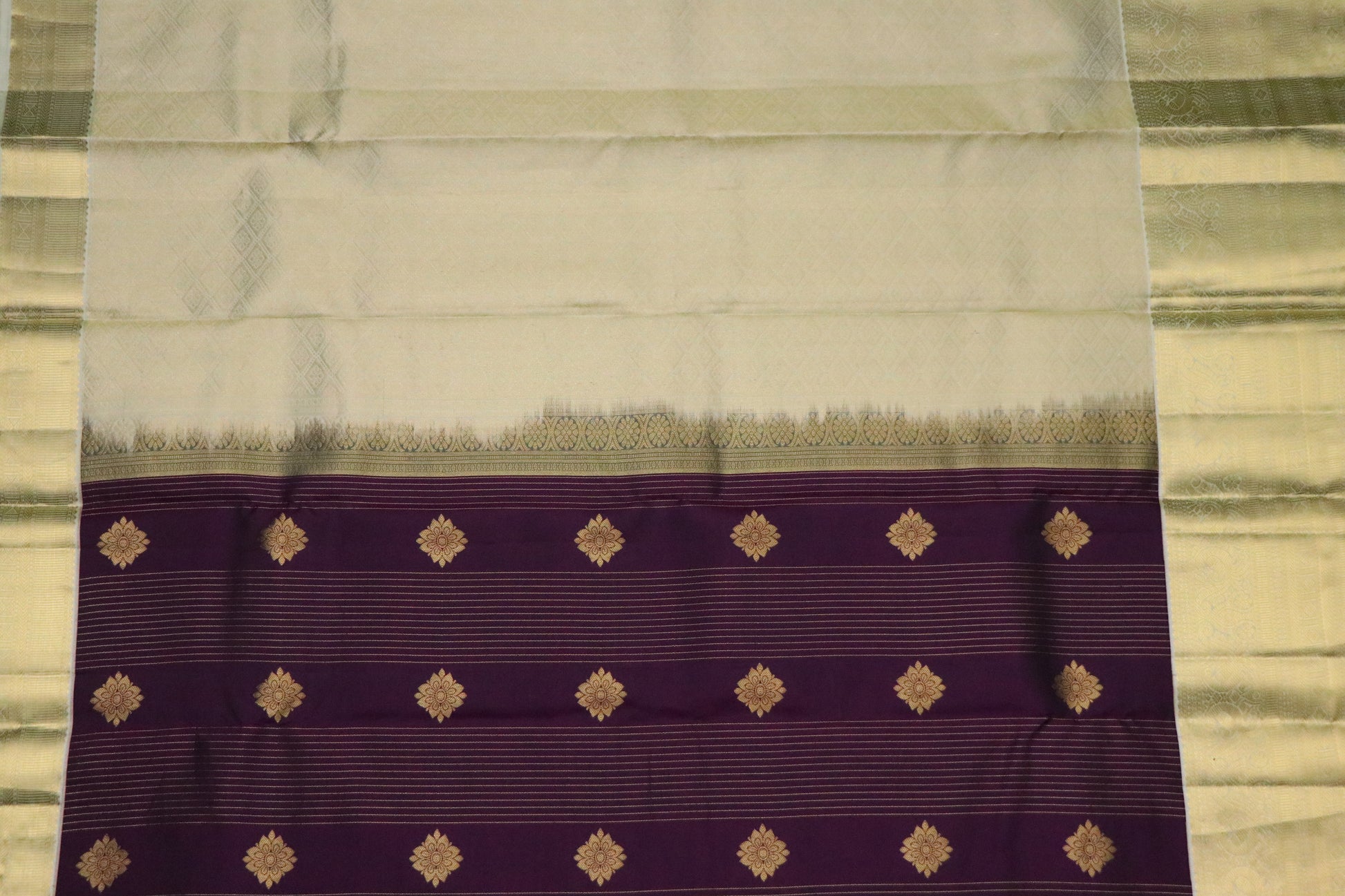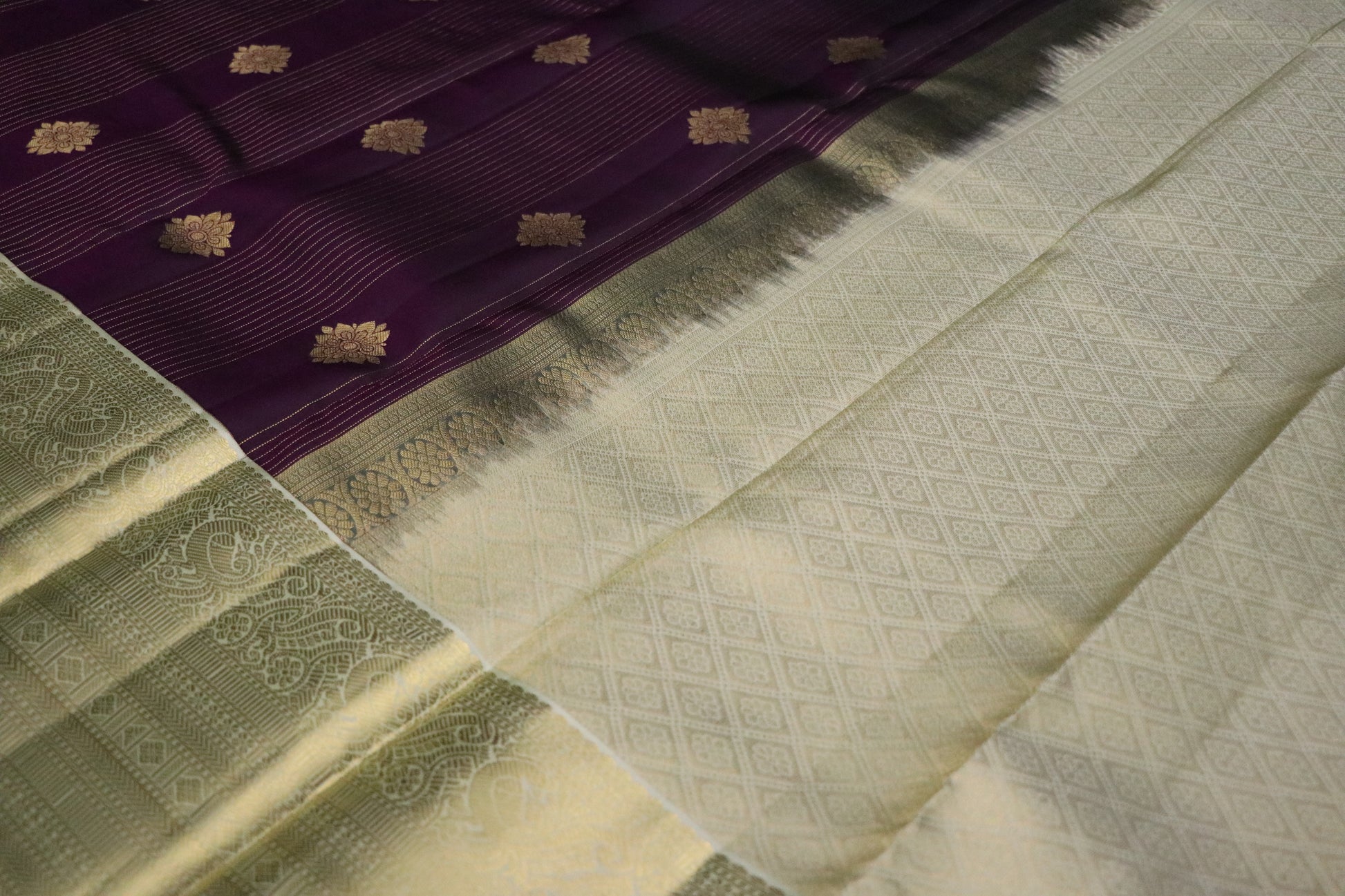 Kanchi Silk-Body-aubergine purple with gold zari buttas and fine vertical gold lines- Border-Soft antique gold