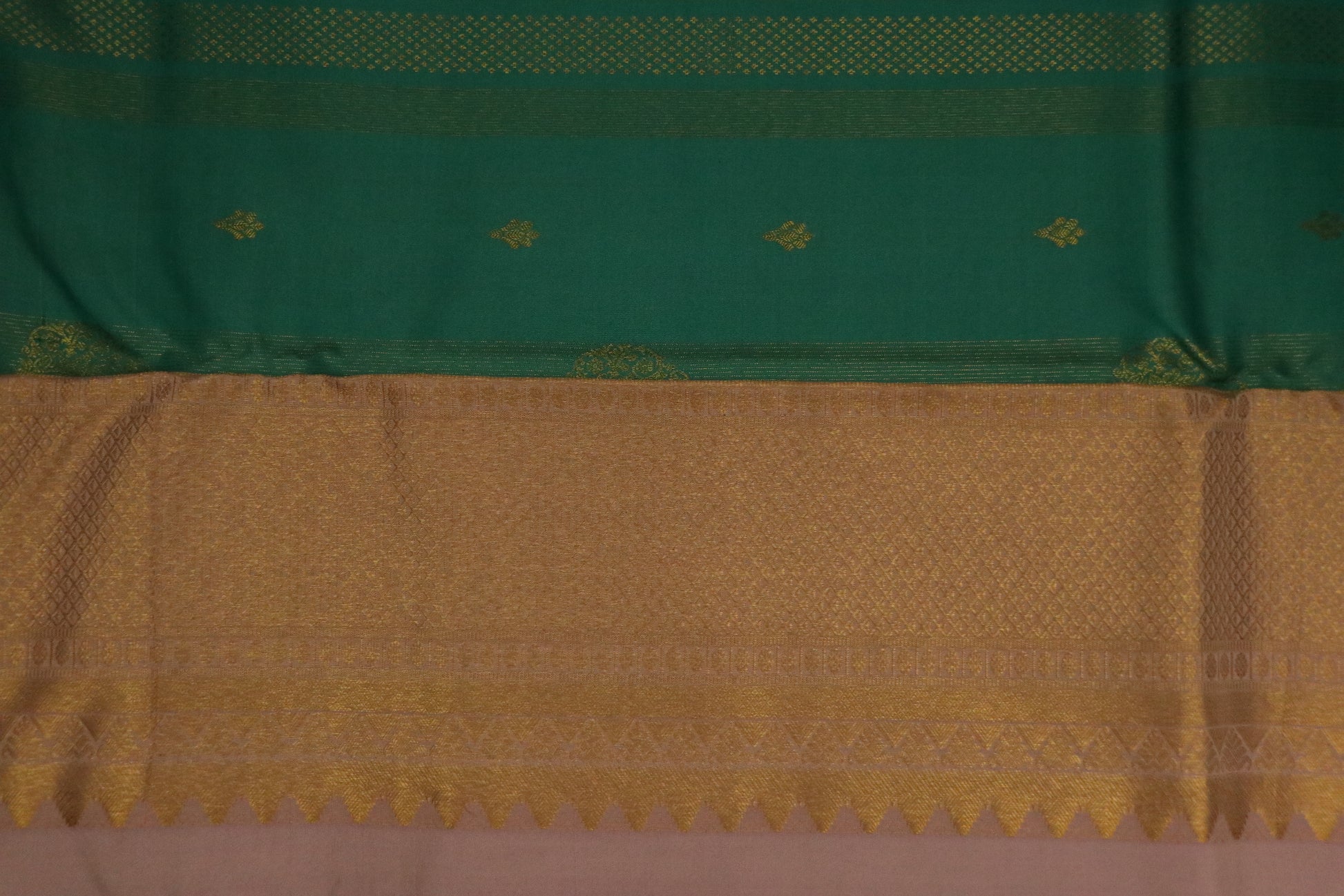 Drape yourself in refined elegance with this luxurious Kanchi silk saree from Daaraa Silks. The deep emerald green body radiates regal charm, beautifully enhanced with delicate gold zari butties and a traditional paisley motif.