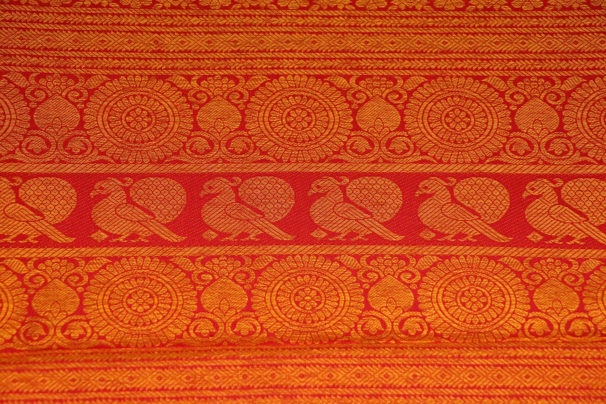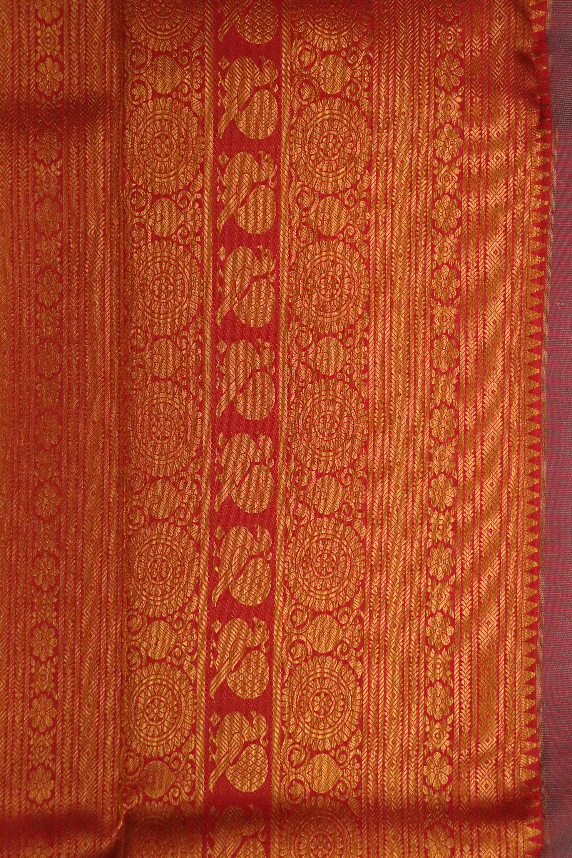 ✔ Rich vermilion red border with antique gold zari motifs inspired by traditional artistry