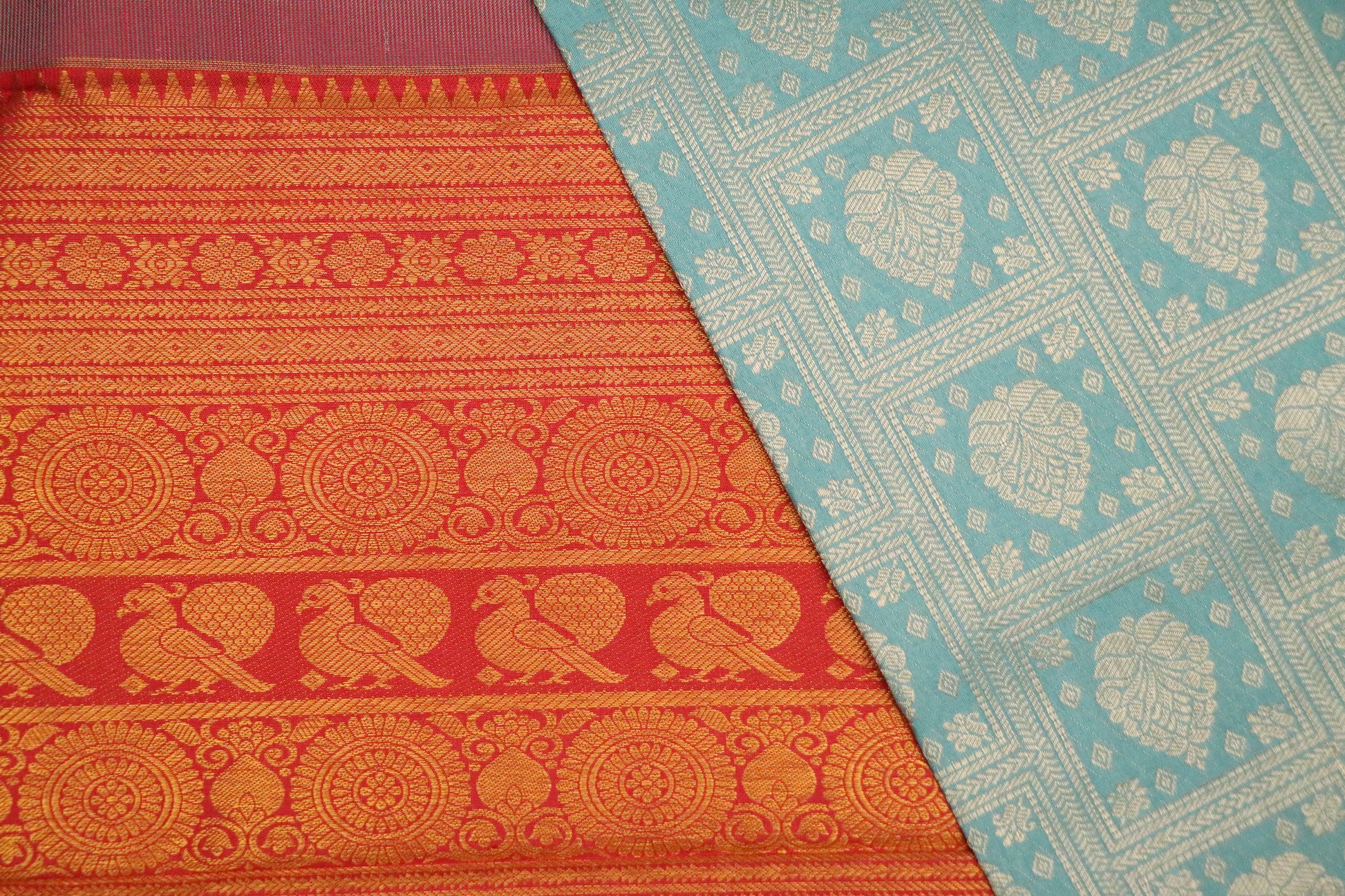 • Design: Pastel turquoise body paired with a vermilion red border featuring antique gold zari motifs such as chakra medallions, kalash symbols, and floral elements
