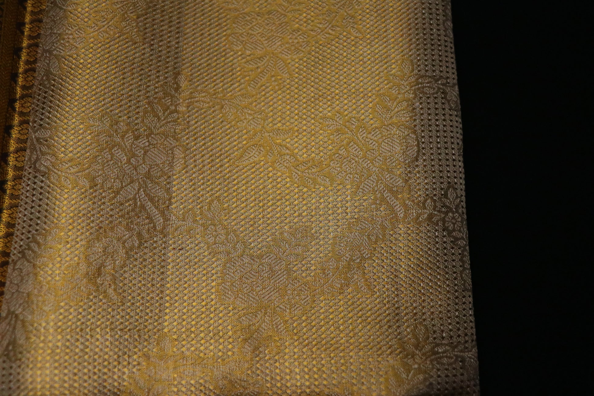 Kanchi Silk-Body-soft antique gold-cream-gold and honey-gold-self-jacquard floral pattern-deep antique gold zari with dark navy/ink-blue accents