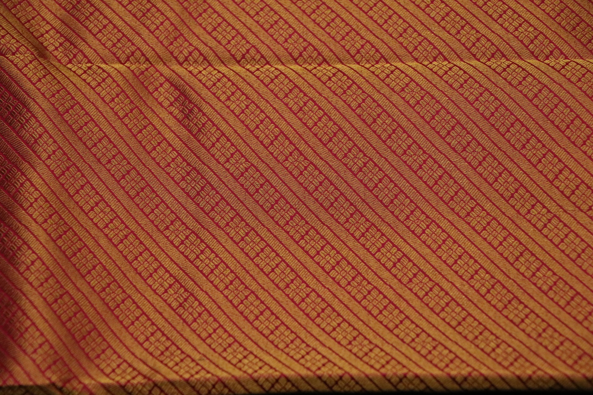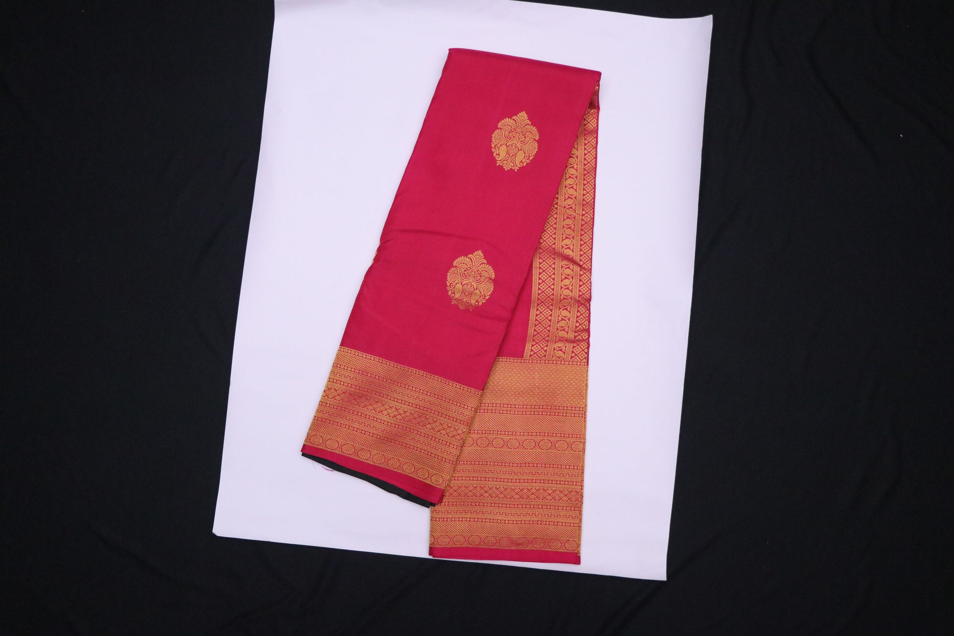 Elevate your ethnic wardrobe with this striking tomato red Kanchi silk saree from Daaraa Silks. The rich crimson base is beautifully complemented by a magnificent antique gold zari border, showcasing intricate traditional motifs.