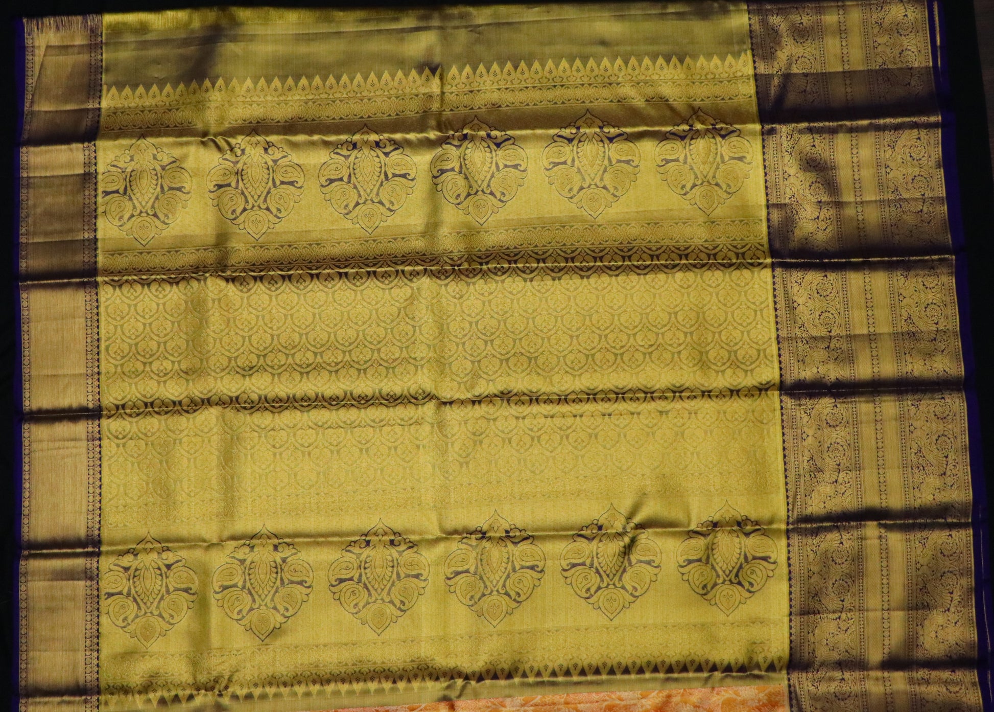 ✔ Distinct navy antique gold zari border with peacock and floral designs