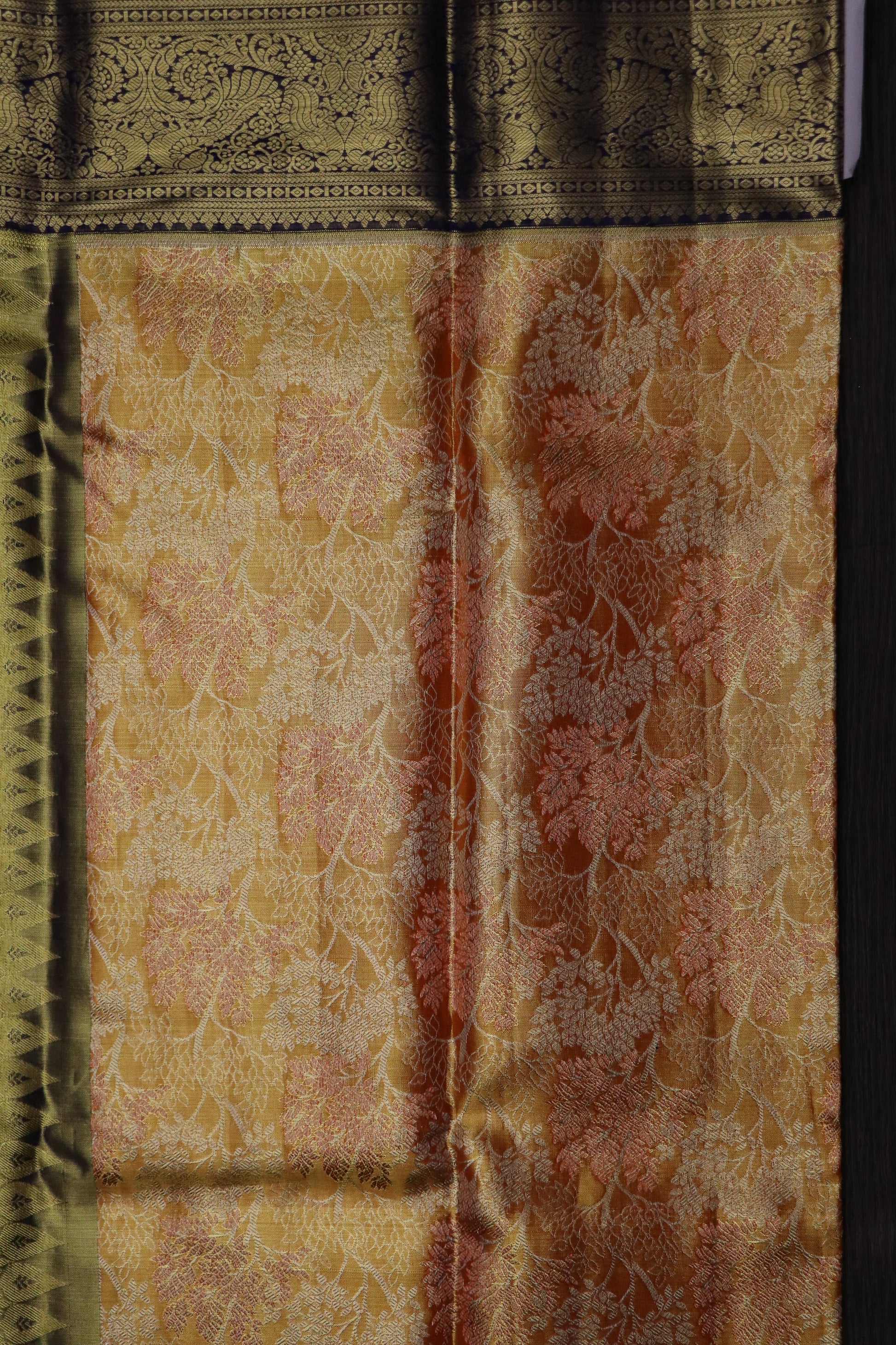 • Design: Mustard-gold body with floral vine jacquard motifs in antique gold and coral-peach tones, framed with rust-copper edges and a navy zari border featuring peacock and floral designs