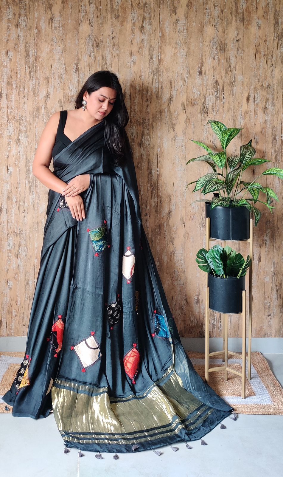 Modal Saree with Mushroo Patch & Tissue Pallu – Black| Daaraa Silks