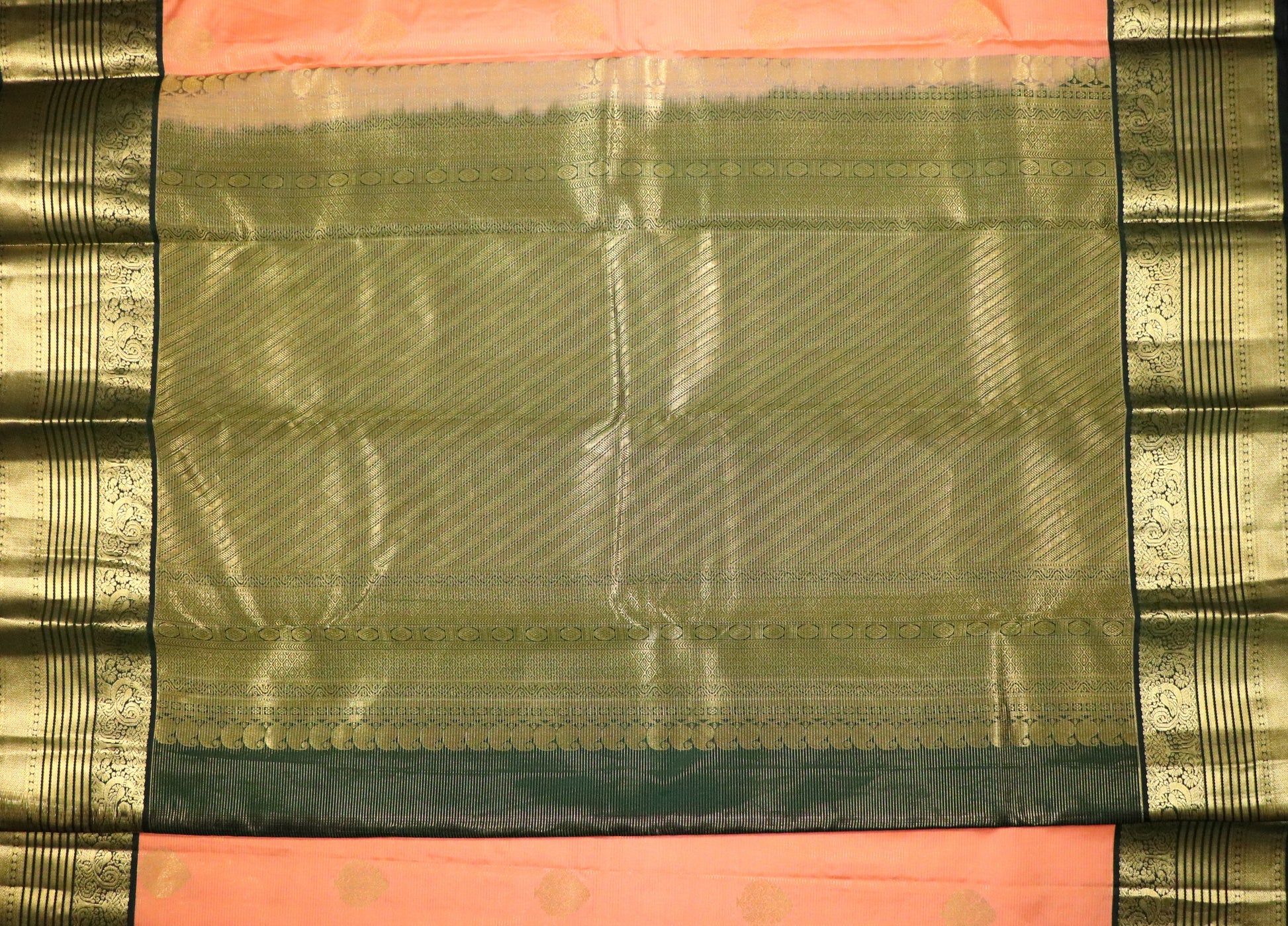 • Design: Warm peach-salmon body adorned with evenly spaced round gold zari buttas, complemented by a rich antique gold zari border with deep olive-black undertones and traditional horizontal bands