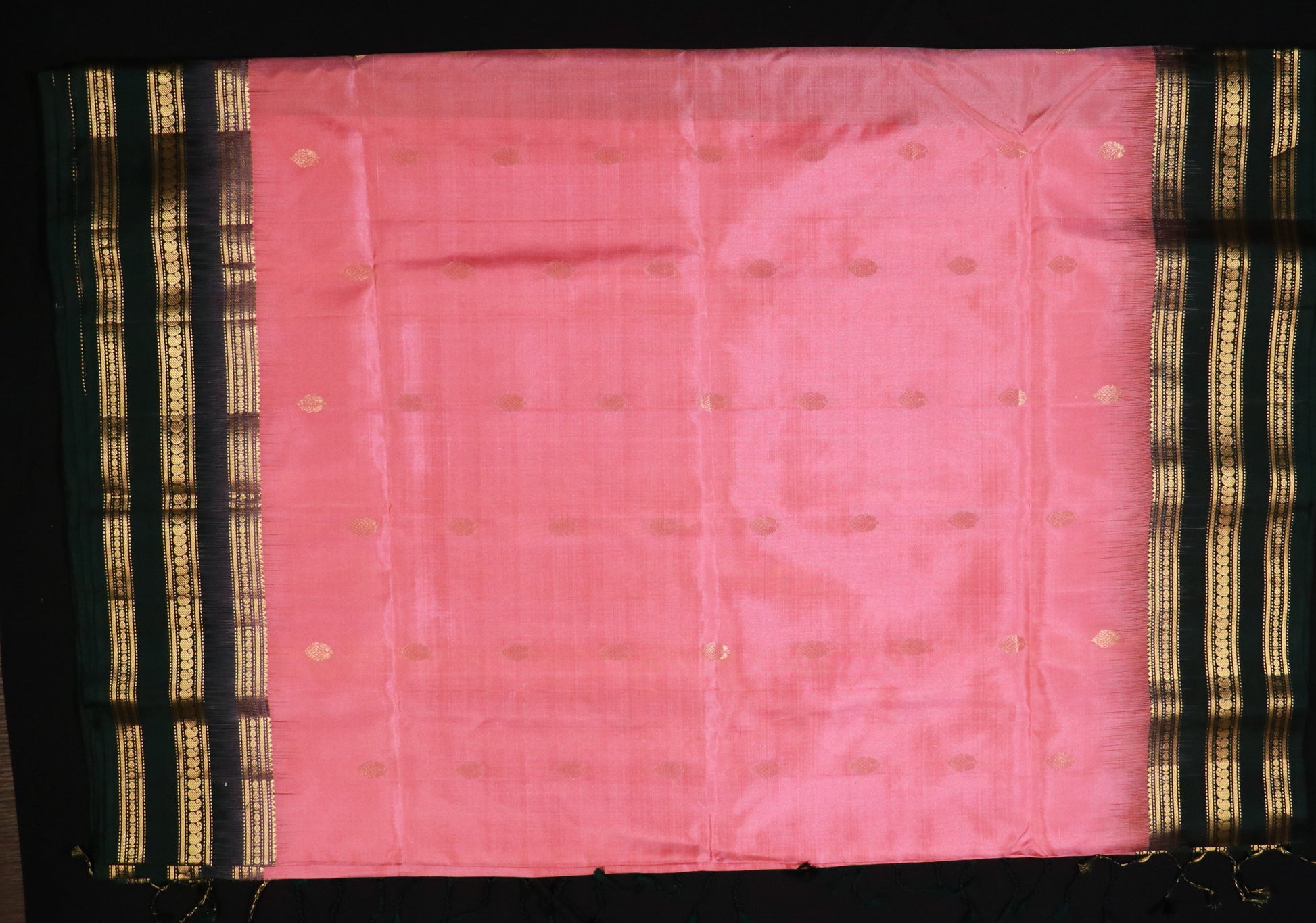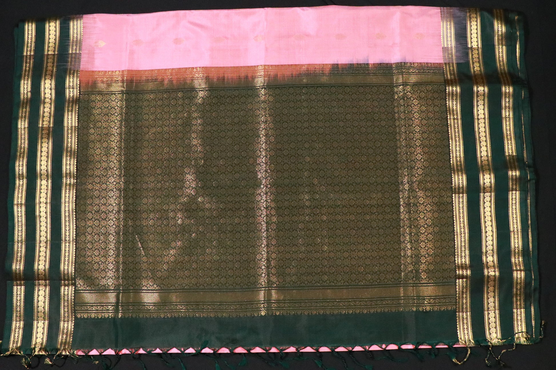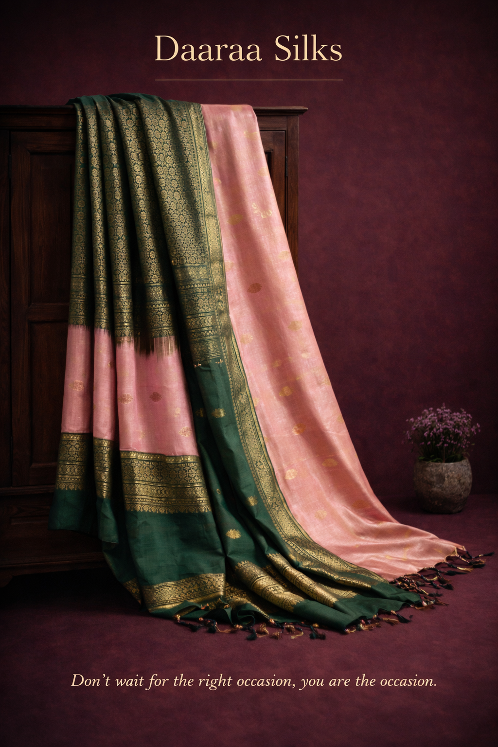 • Design: Soft pastel pink body adorned with richly woven gold zari motifs, complemented by deep olive green borders featuring intricate antique gold zari work