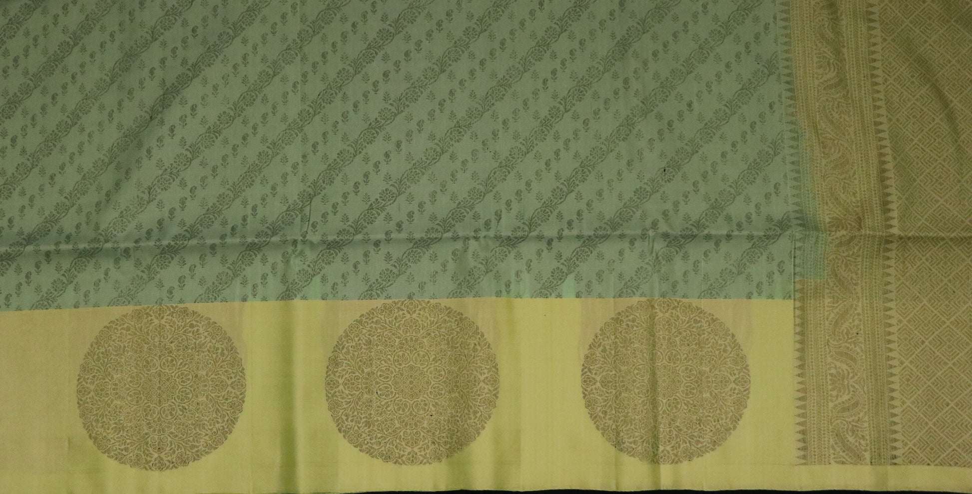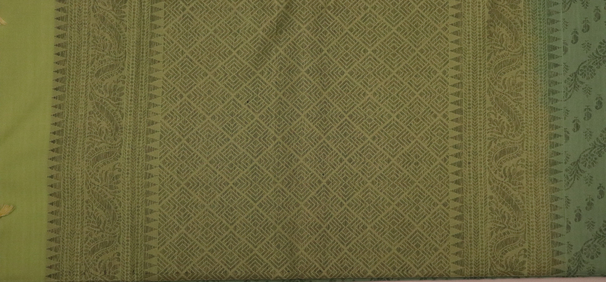 • Design: Yellow-green body with tone-on-tone geometric diamond lattice pattern, complemented by a pista green border and olive-green pallu