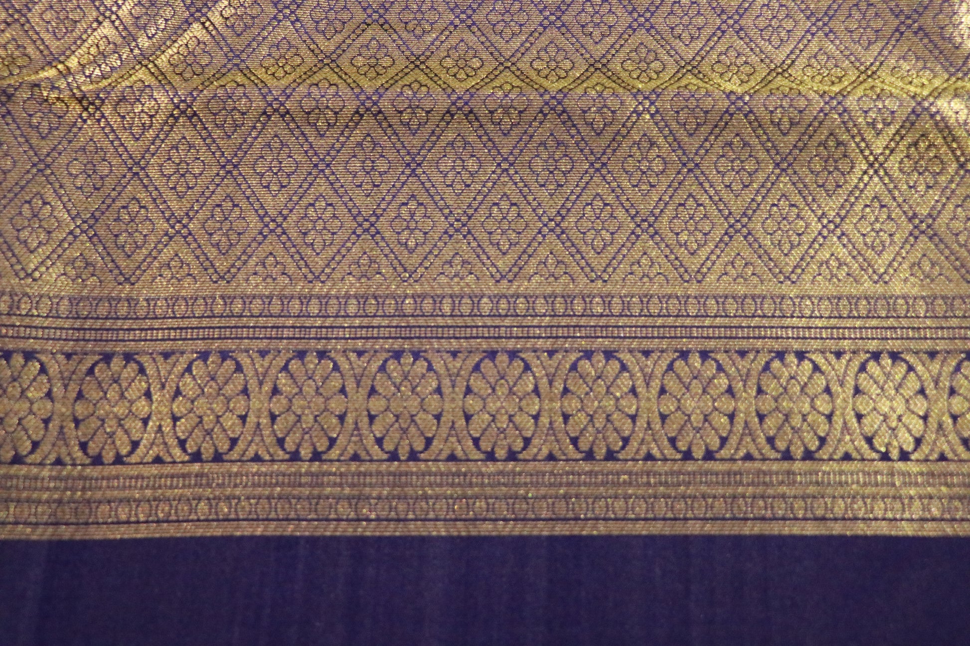 ✔ Rich antique gold zari border with traditional floral and geometric patterns