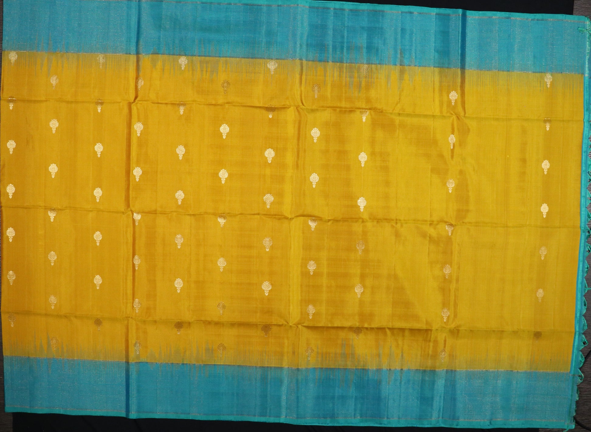 • Design: Sophisticated teal blue body adorned with delicate paisley (mango-shaped) buttas, complemented by a striking mustard-gold contrast border